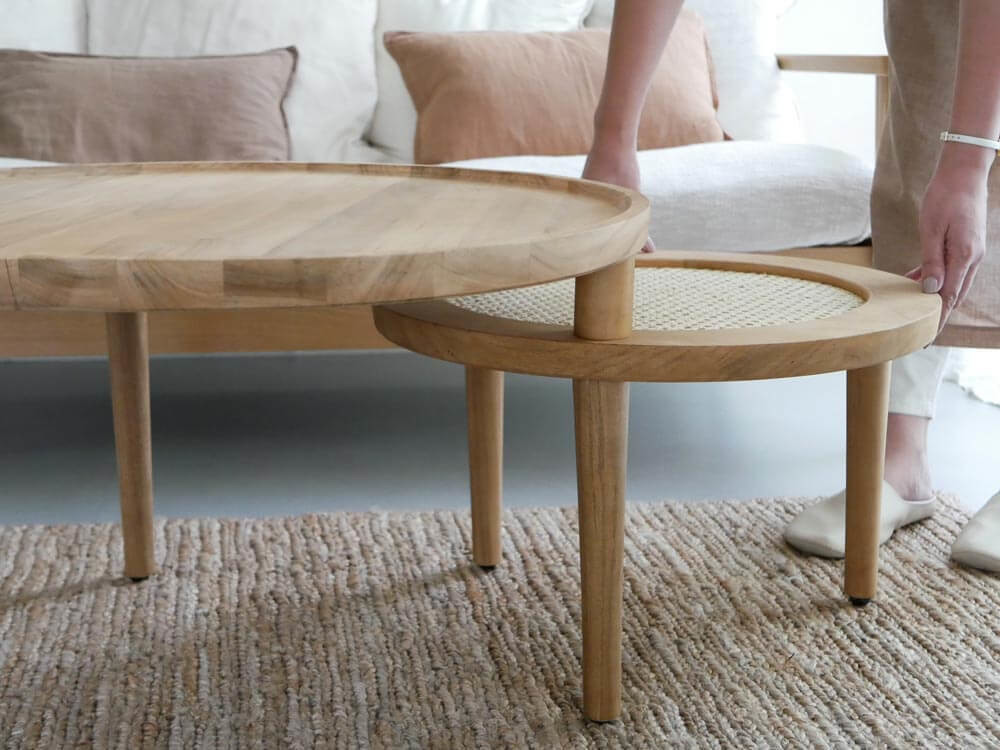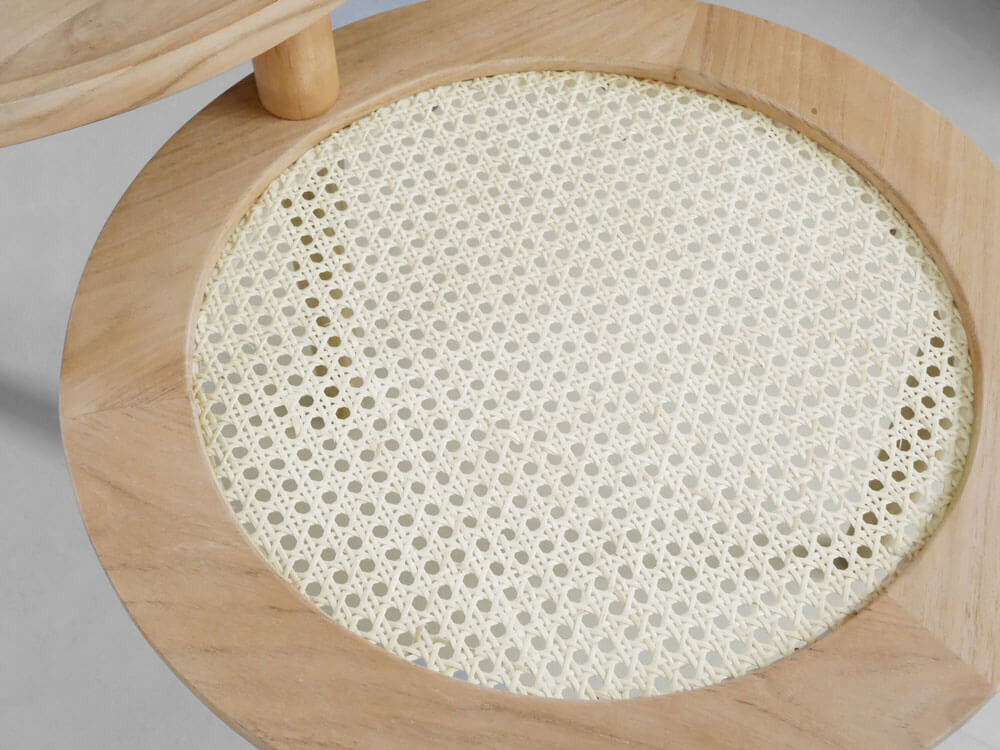 サブテーブルは縁はチーク材、中央はラタンの丁寧な編み込みでより温かく素朴な風合いが魅力。 さらにラタンが一本一本編み込まれることにより、華やかさも添加され、リビングに置くインテリアとしても充分な存在感です。