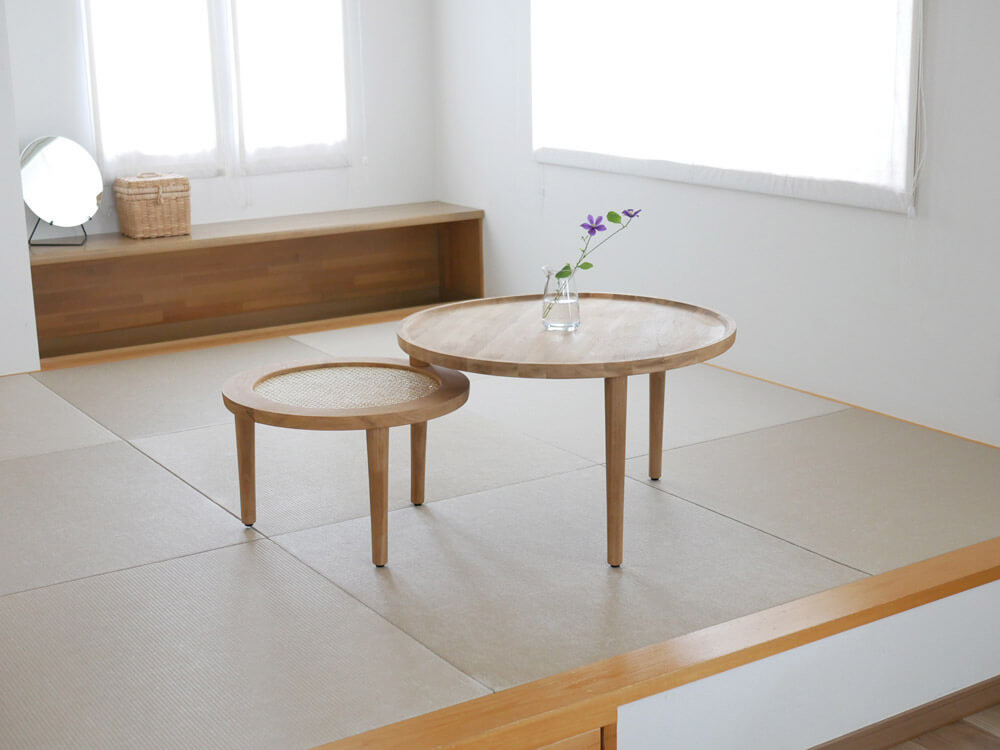 畳の自然素材と合うチーク無垢材の無塗装仕上げが、和室にもぴったり。畳もテーブルも同じアースカラーなので、悪目立ちせず自然な仕上がりに。