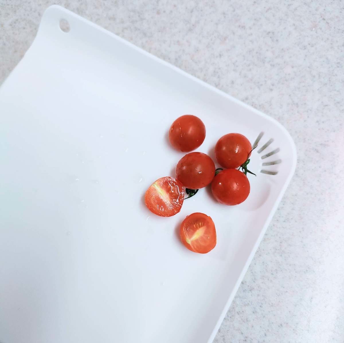 多機能まな板は、転がりやすい食材を切ってもこぼれて落ちないデザインなので、プチトマトもらくらくカットできます。
