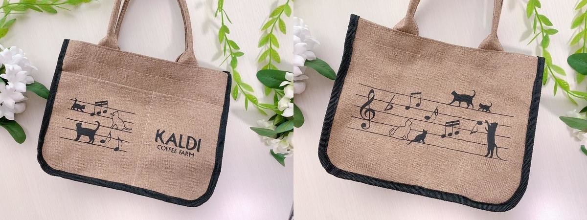 カルディオリジナルのネコバッグ。表も裏もかわいらしいネコちゃんがいっぱい。音符と並んだイラストは見ているだけで楽しい気分になります♪