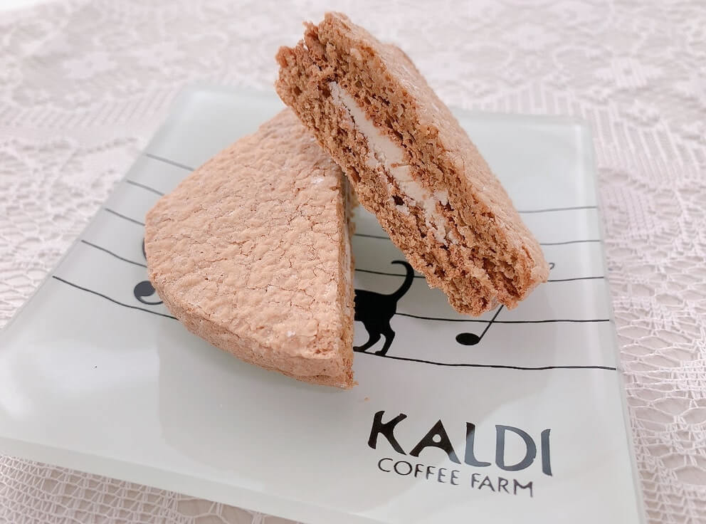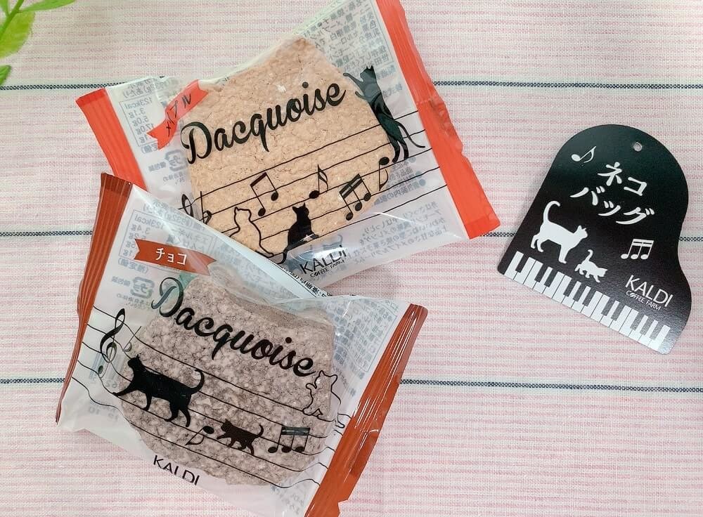 カルディのネコバッグには、優しい味わいのメイプルクリームと濃厚なチョコクリームをサンドした、キュートなネコ型のダックワーズが2種類入っています。