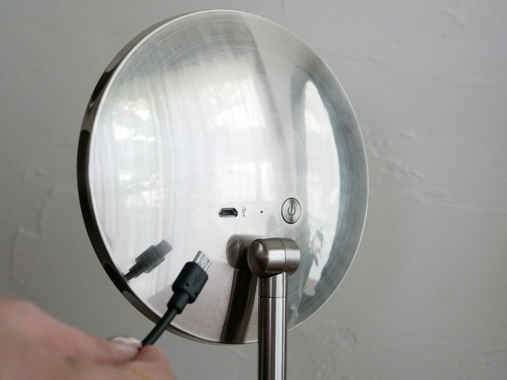 バッテリー寿命は1回の充電で約5週間持続。 充電をする際は、「ミラー」の裏の差込口に付属のUSBコードをつないで充電をしてくださいね。