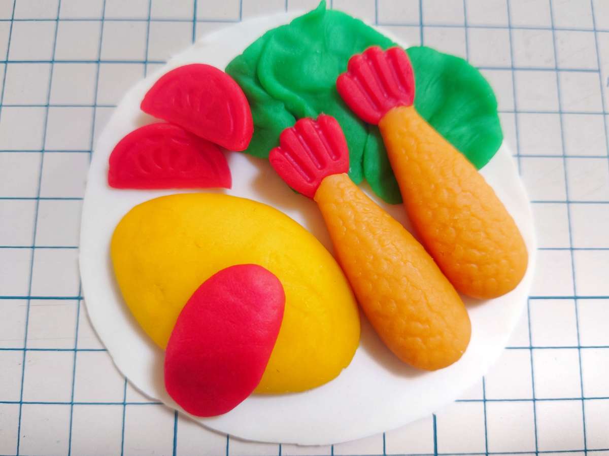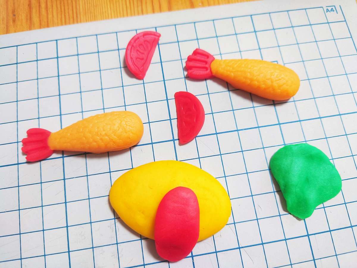 オムレツとエビフライや、付けあわせの野菜をセットの粘土で作ることができます!