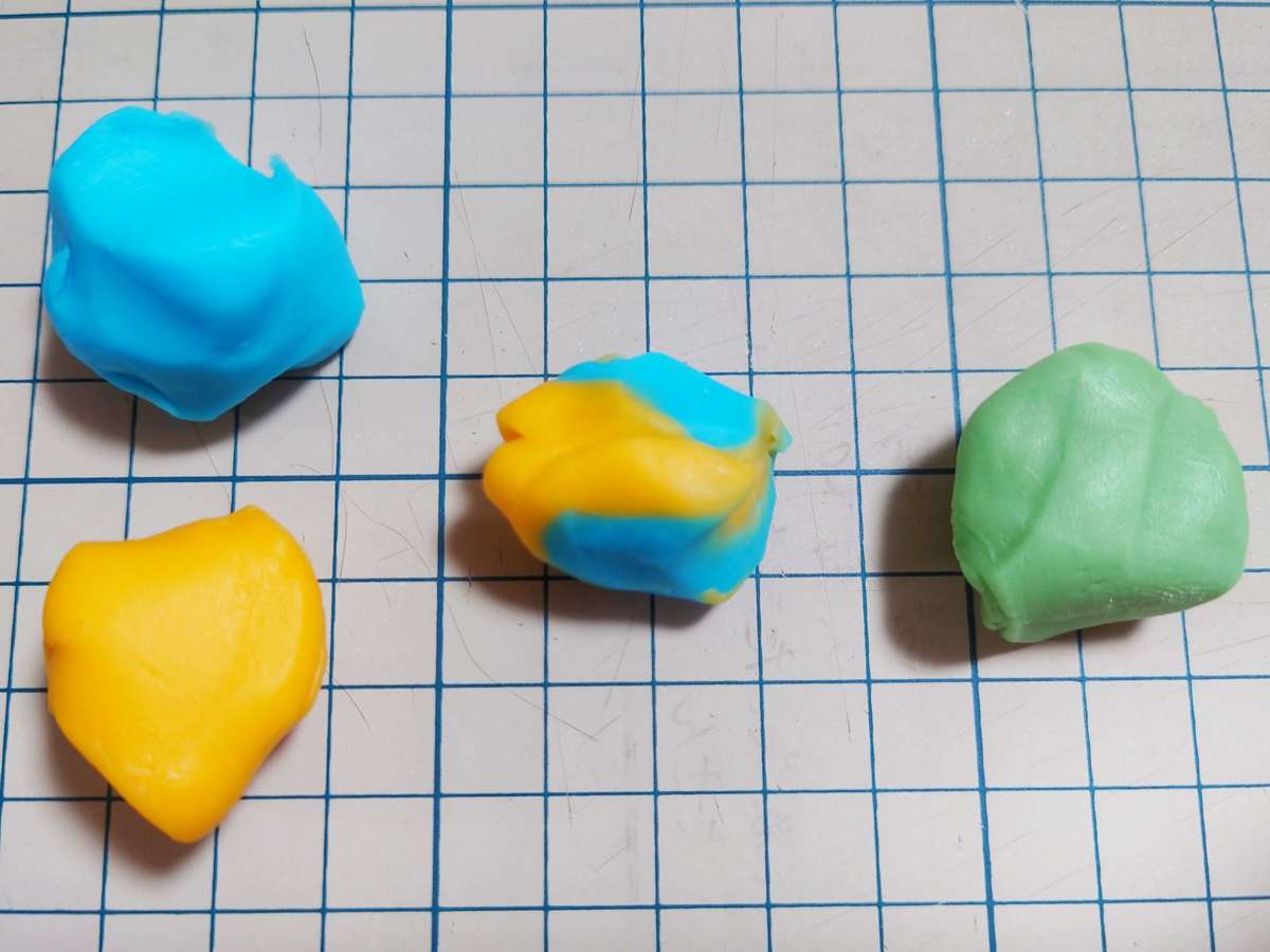 例えば、写真のように同じ量の青色と黄色の粘土を混ぜると優しい緑になりました。