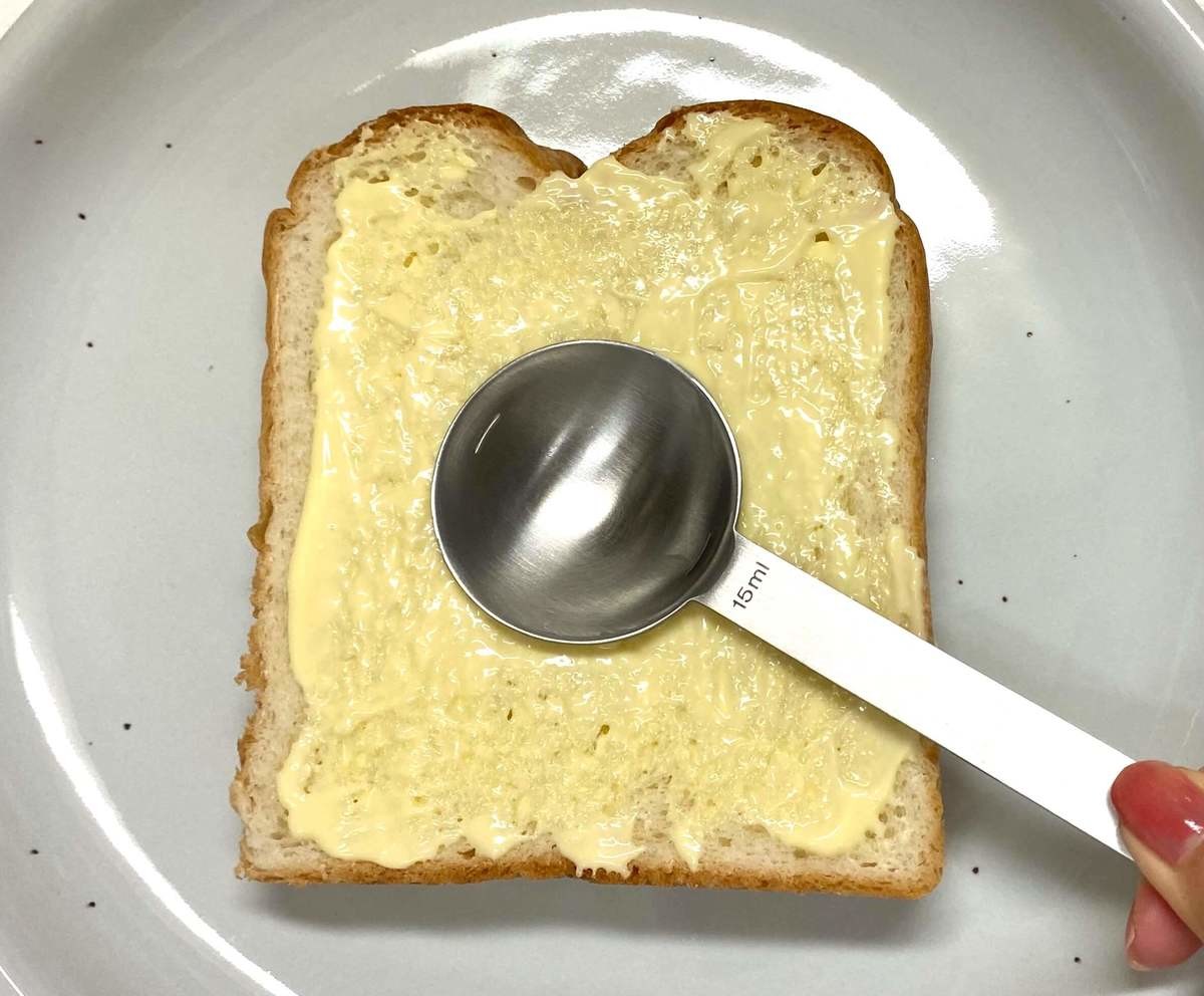 卵を食パンに乗せる時に、白身が少しこぼれてしまいました。大さじの計量スプーンなど、卵全体が収まるような、大きめサイズの凹みを作りましょう。