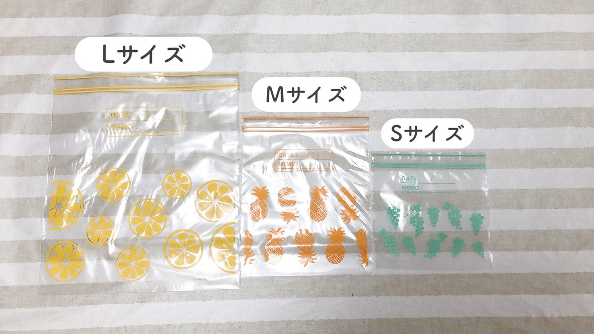 私が愛用しているフリーザーバッグは、ダブルジッパータイプ(マチなし)のS・M・Lサイズです。