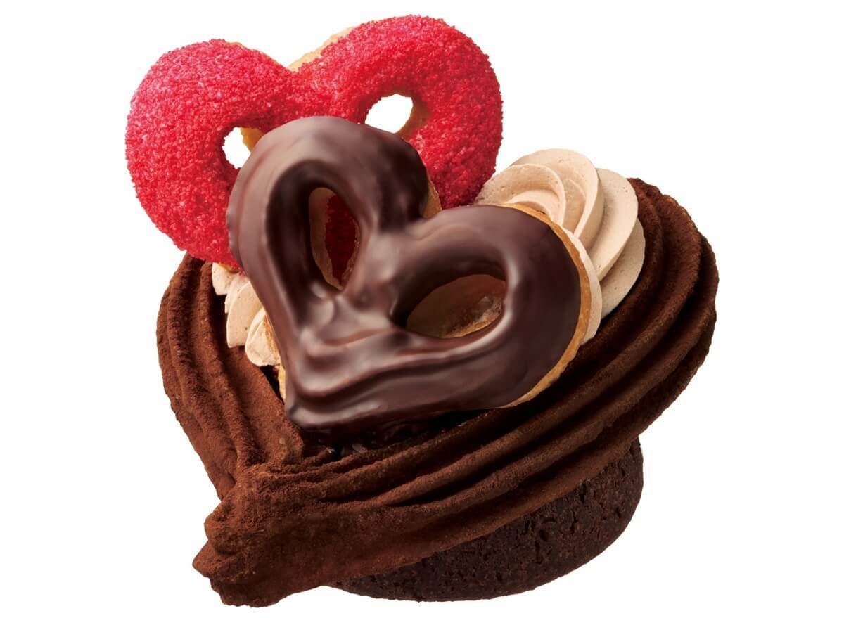 トリュフショコラをイメージしたなめらかな食感のショコラドーナツ生地にプラリネホイップを絞りチョコレートをコーティング。プラリネホイップ、ガナッシュクリーム、ガナッシュホイップを重ね、それぞれココアパウダー、ストロベリーチョコとストロベリーシュガー、チョコレートで仕上げた3種のハートチュロを組み合わせました。