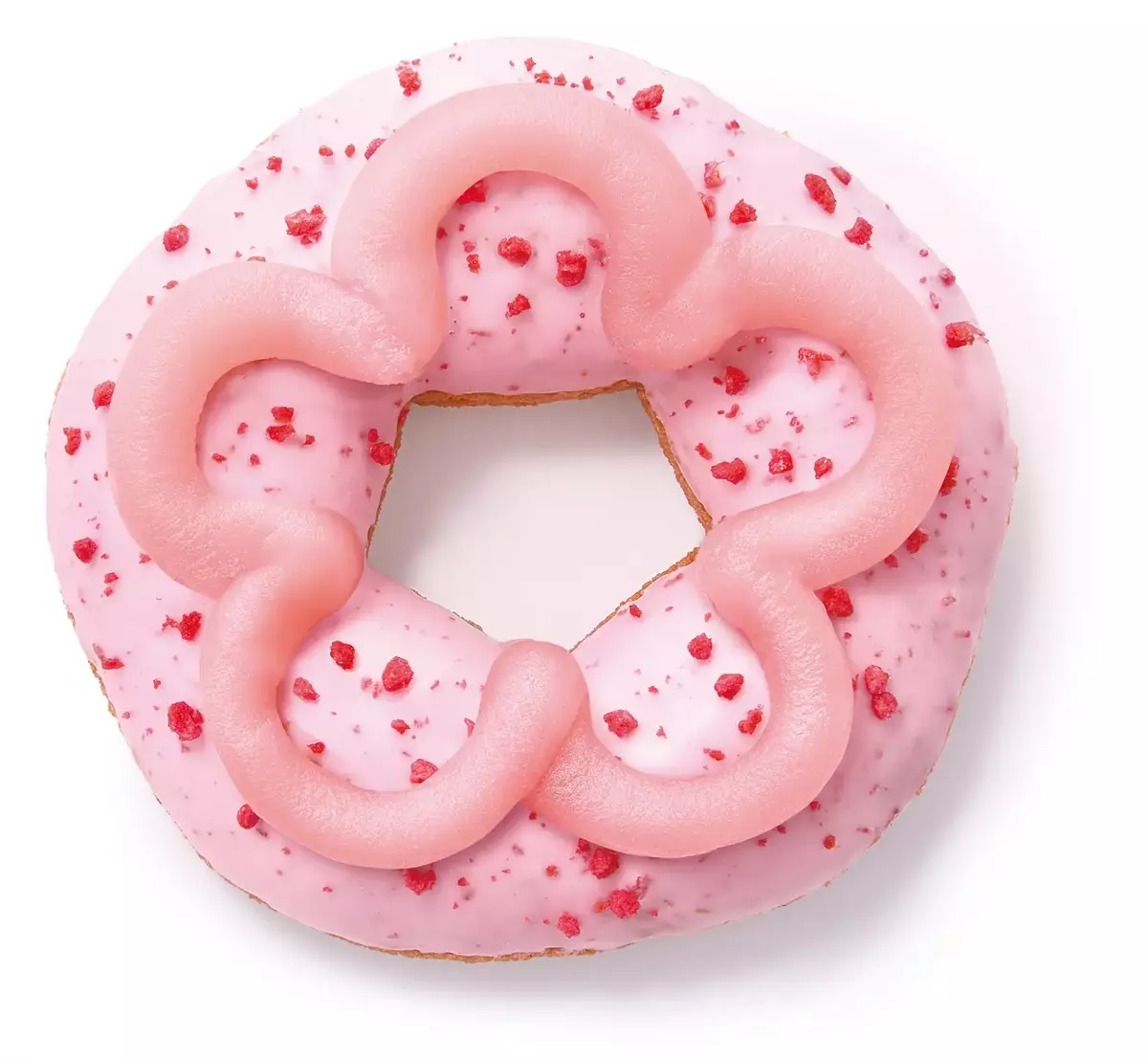 桜風味のもちっとした生地にストロベリーチョコをコーティングし、いちご顆粒をトッピングしました。いちごピューレ入りのいちごみるくあんをパっと花が咲くように絞り桜を表現した、見た目も春らしいドーナツです。