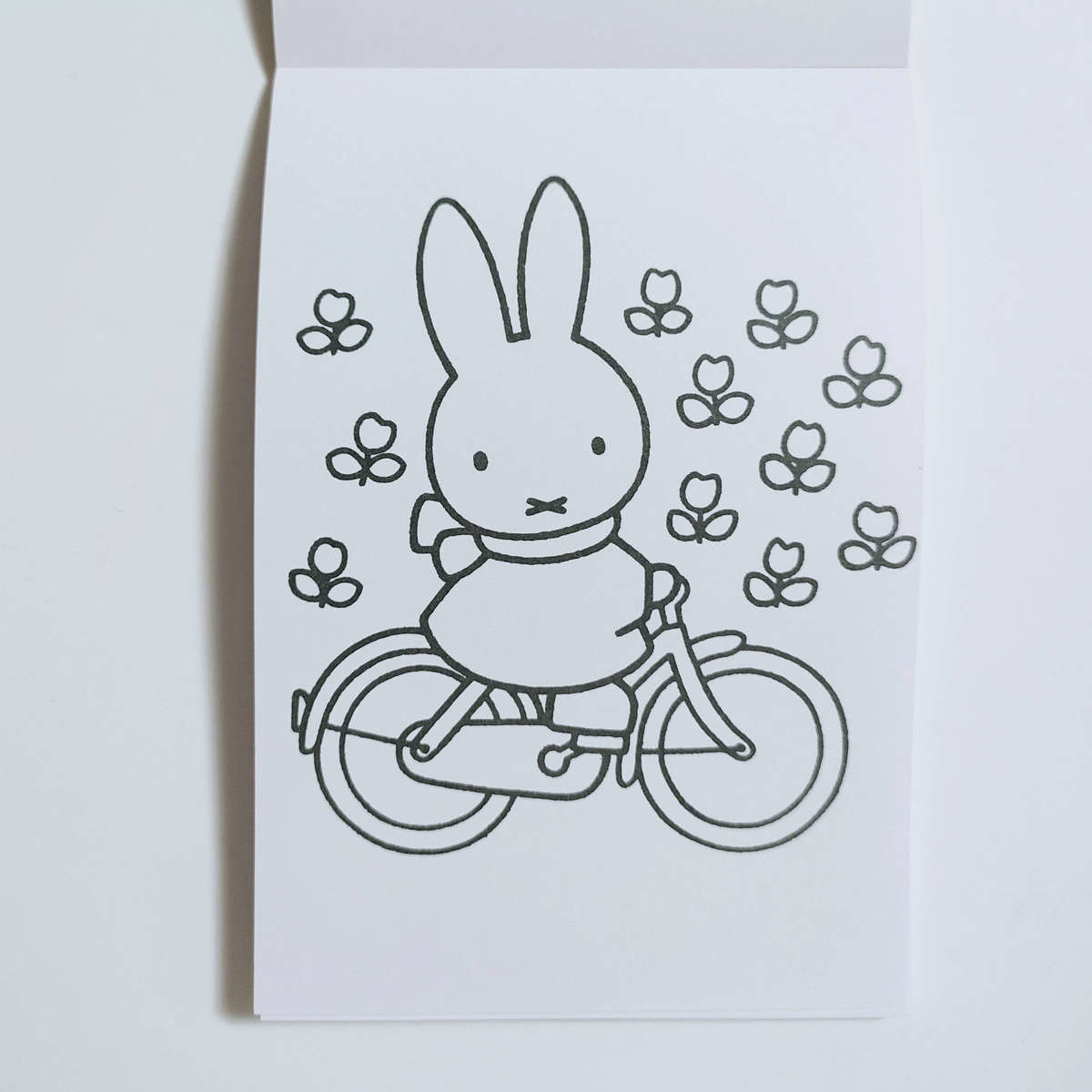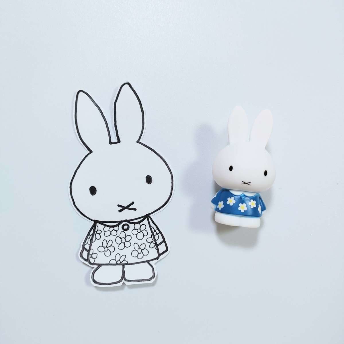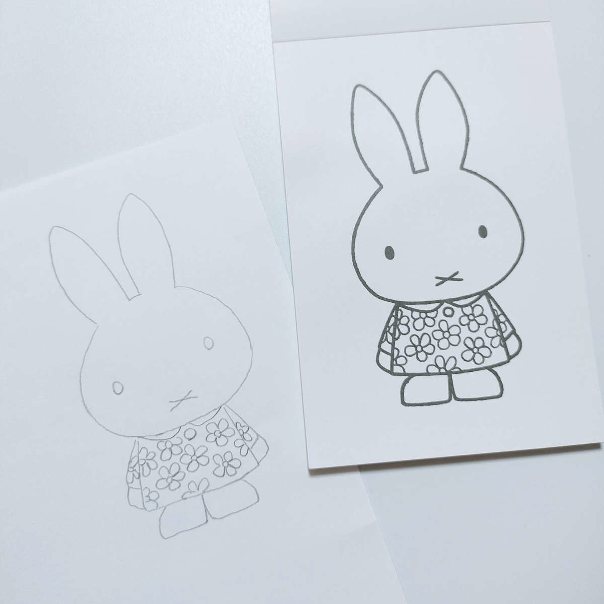 塗り絵の中に、私の好きな花柄ワンピのミッフィーがあったので、紙にシャーペンでなぞり……。