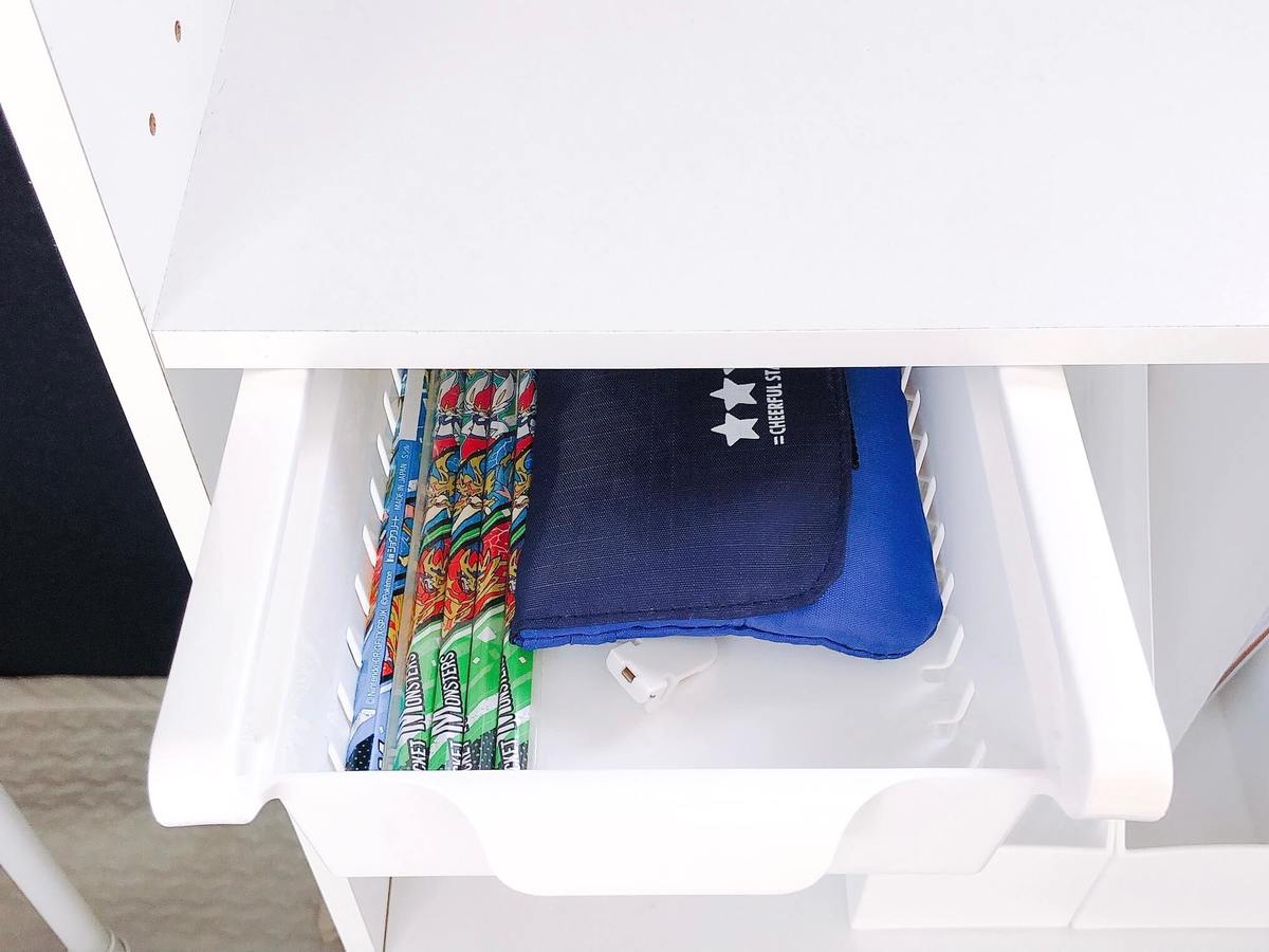 あくまで小物収納ですが、しっかり大きめなので鉛筆など文具のストックもすっきり収まりました♪