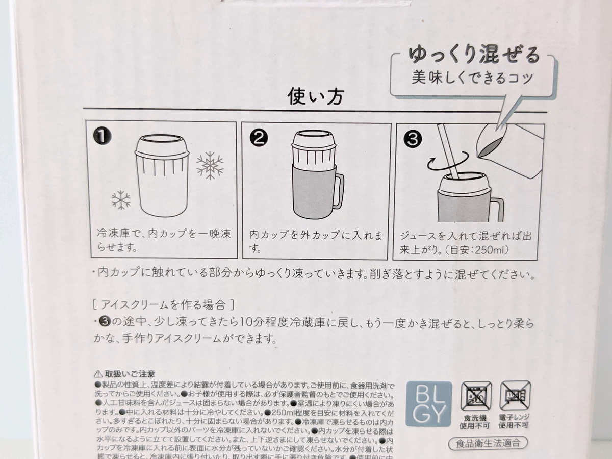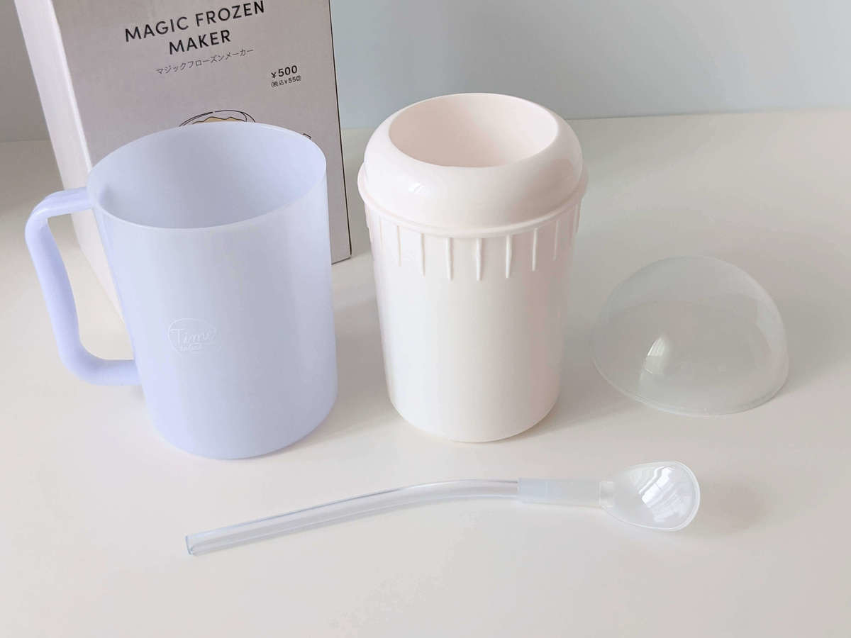 まず、冷凍庫で内カップを一晩凍らせます。そして内カップを外カップにセットし、250mlのジュースを入れて混ぜるだけ♪