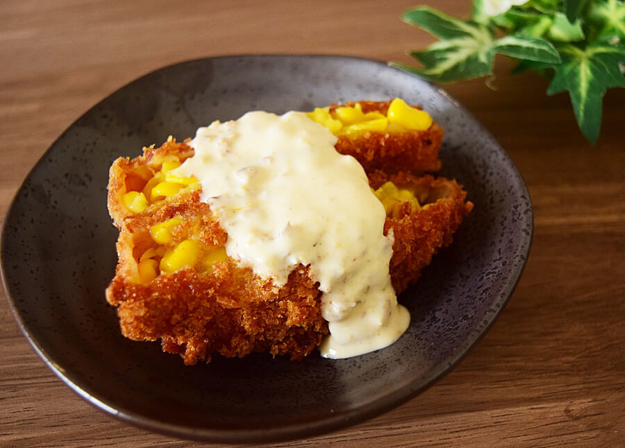 コーンクリームコロッケにいぶりがっこタルタルをつけてみました。ポリポリとした大根に燻製の香り、マヨネーズソース……一見ミスマッチないぶりがっこタルタルですが、なぜかコーンクリームコロッケと合うんです……!