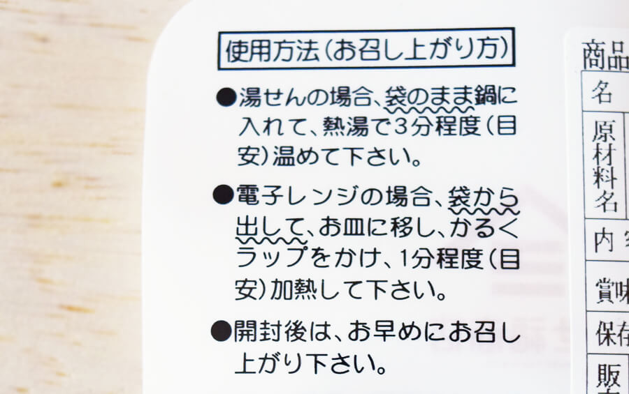 袋のまま、沸騰したお湯の中に入れて3分温めたら完成です。電子レンジ調理もOK。調理方法は袋の裏面に書かれていましたので、参考に。