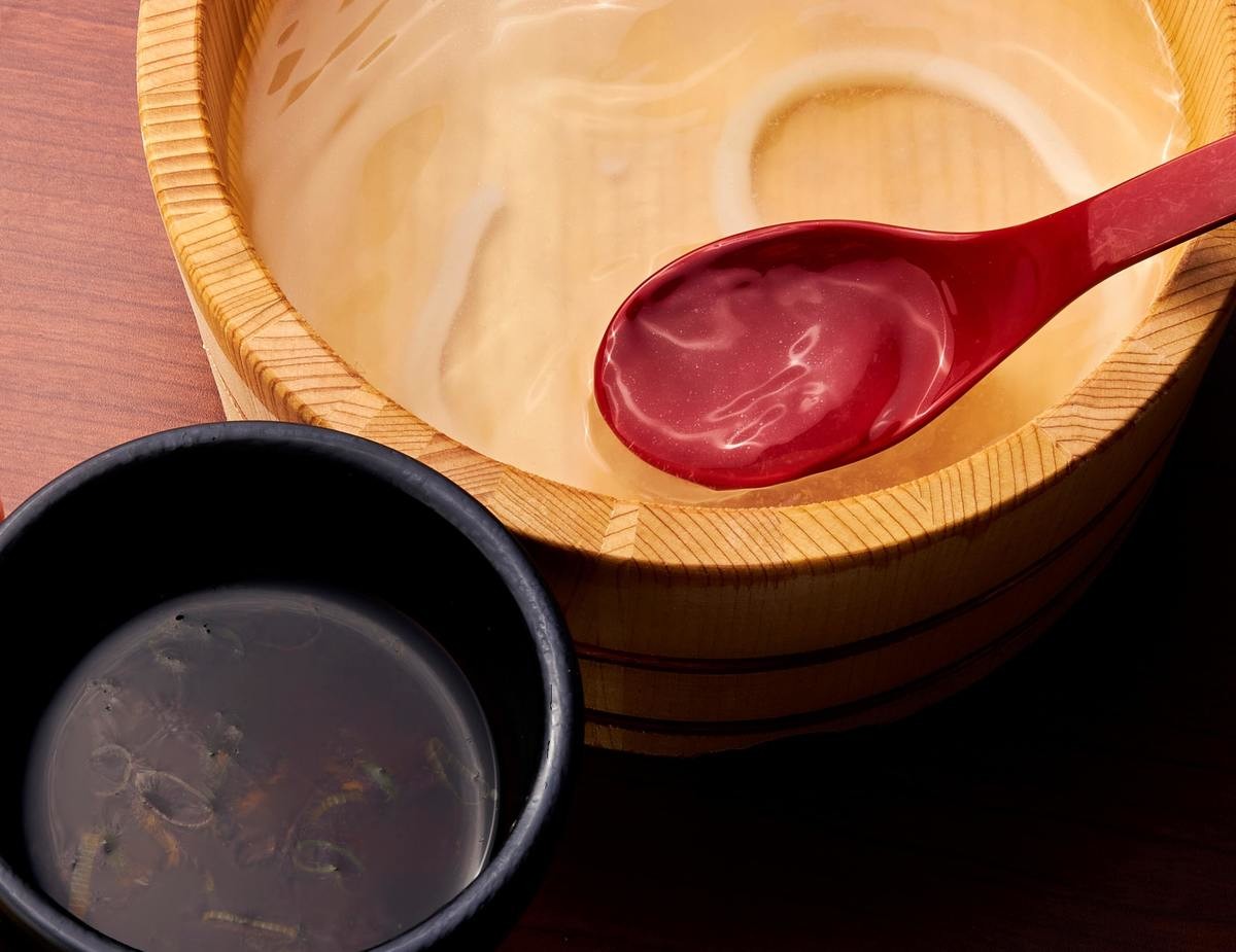 その後、桶に残った釜湯を残ったつけだしに入れ、お好みで青ねぎ、天かす、おろししょうがやすりごまなどお好みの薬味を入れてお召し上がりいただくと、だしに薬味の風味が足されぐっと奥行きのある味わいへと変化します。