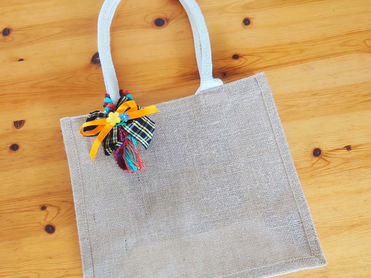 ジュートマイバッグは、ナチュラルテイストで使え魅力的ですが、アレンジで個性を出すこともできます。