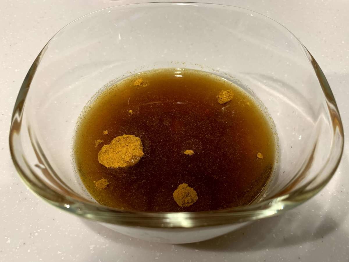 作り方②麺つゆ・水・カレー粉・納豆を混ぜてつゆを作る