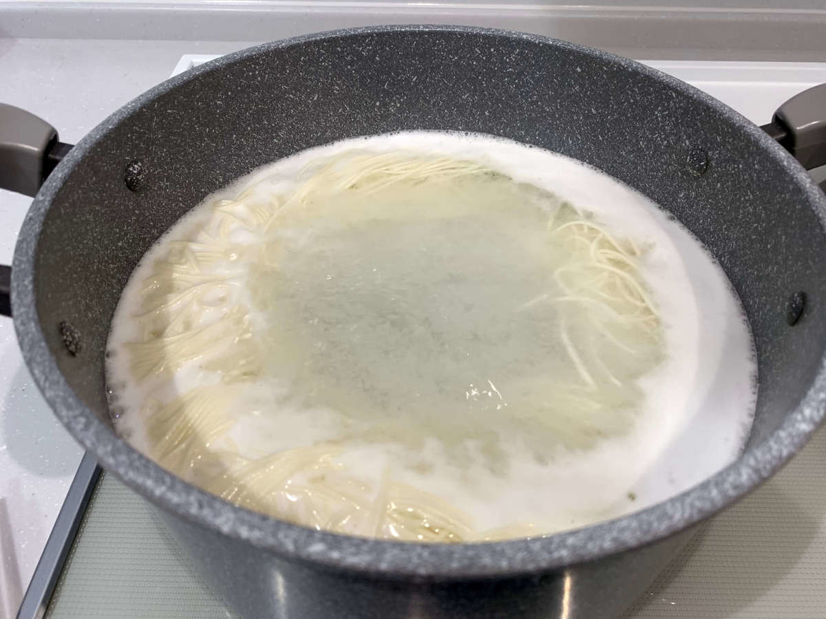 たっぷりのお湯が沸騰したら、そうめんを既定の時間茹でましょう。