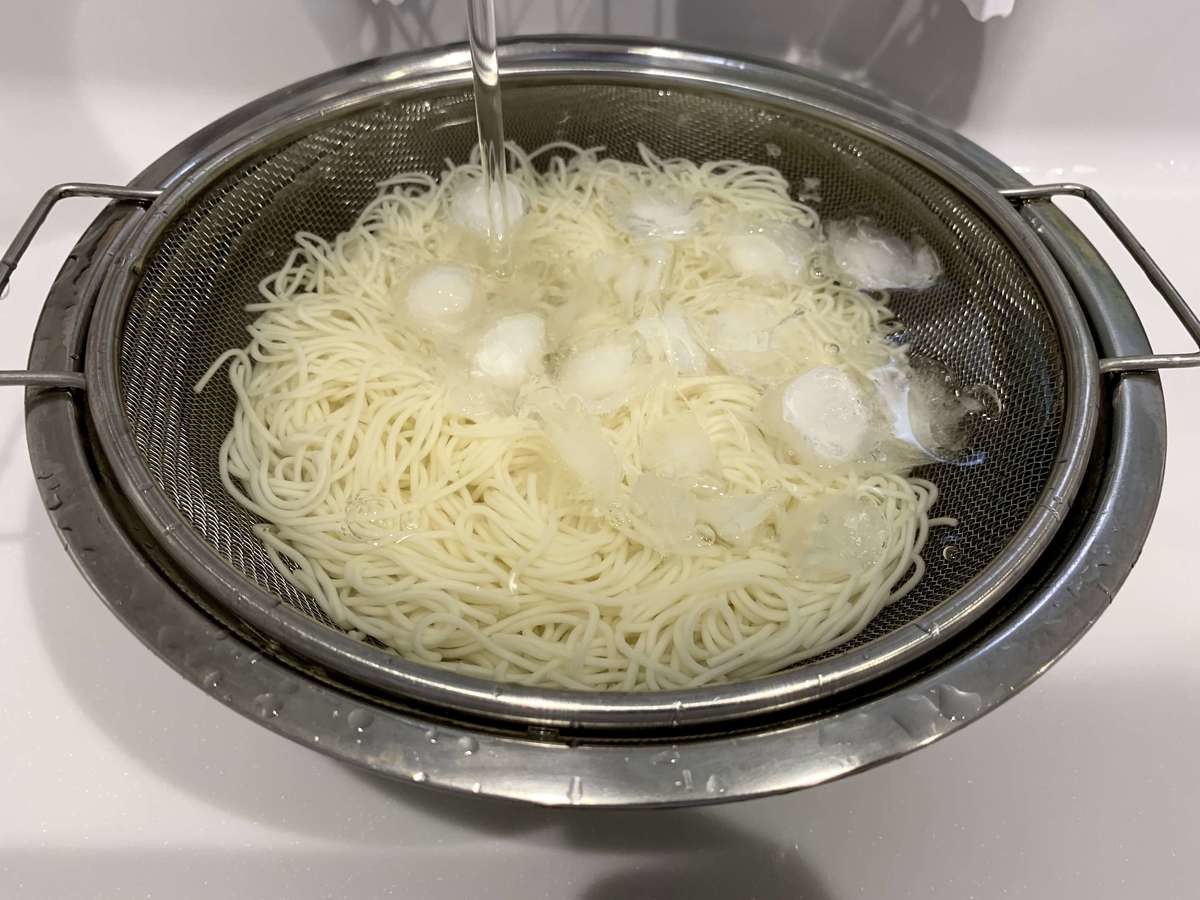 作り方①そうめんを既定の時間茹でて、冷水でもみ洗い