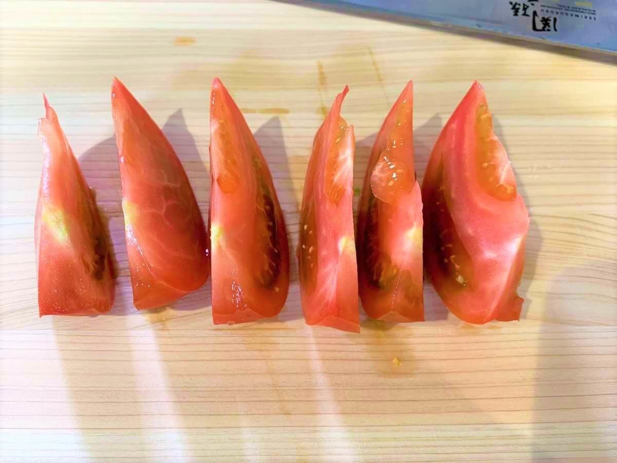 トマトを縦半分に切ります。切ったトマトをさらに1/3にし、6等分にします。