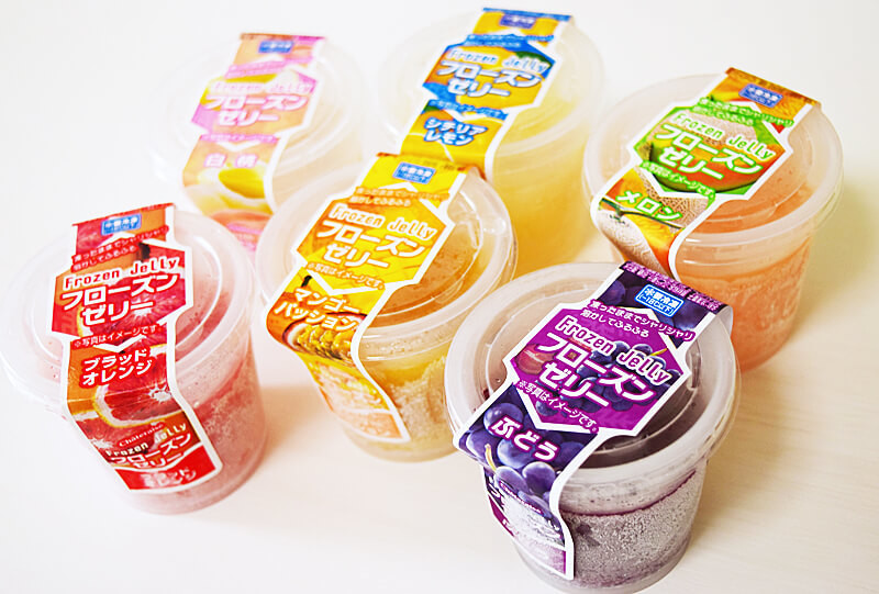 凍った状態ではシャーベットとして、解凍したらゼリーとして、と個人の好みによって食べられる冷凍スイーツです。2021年8月現在、フローズンゼリーは以下の6種類。