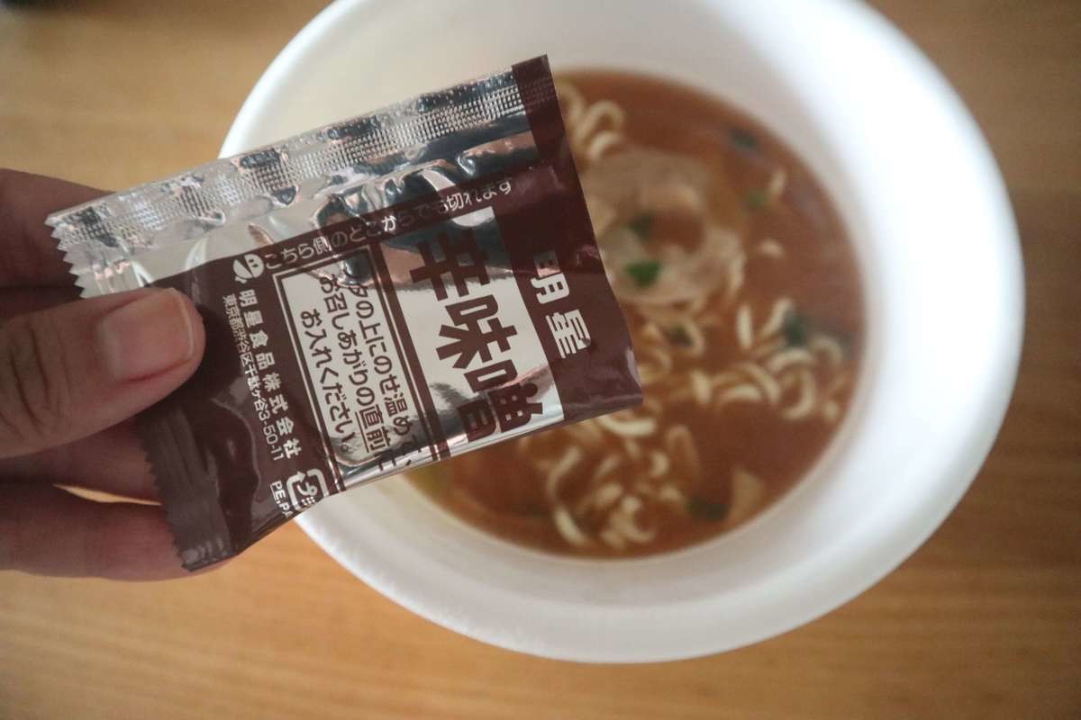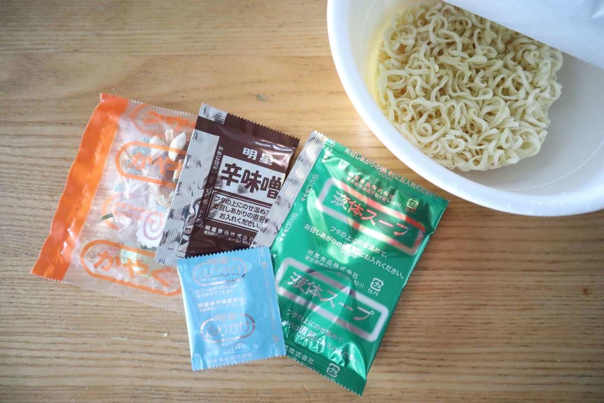 麺は、ノンフライ麺。 液体スープ、辛味噌、ふりかけ(あおさ)、かやく(チャーシュー、メンマ、なると、ねぎ)が入っています。