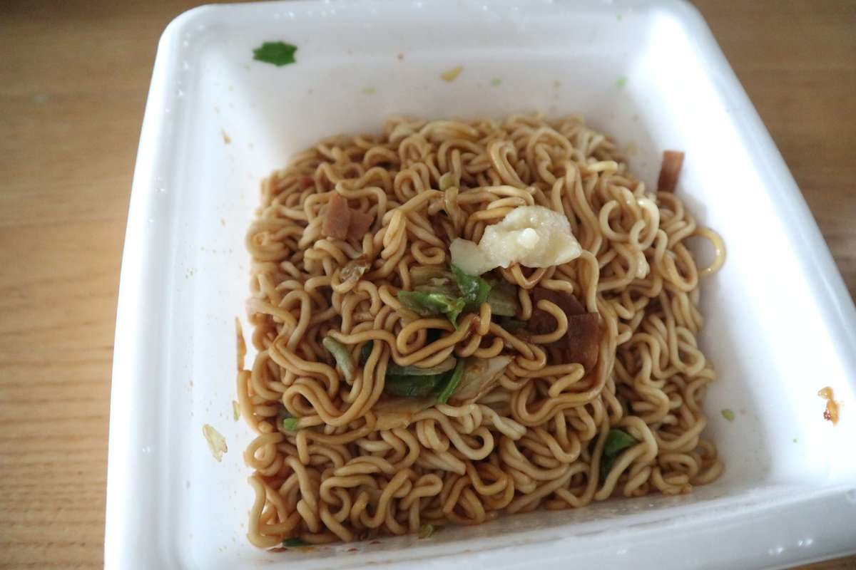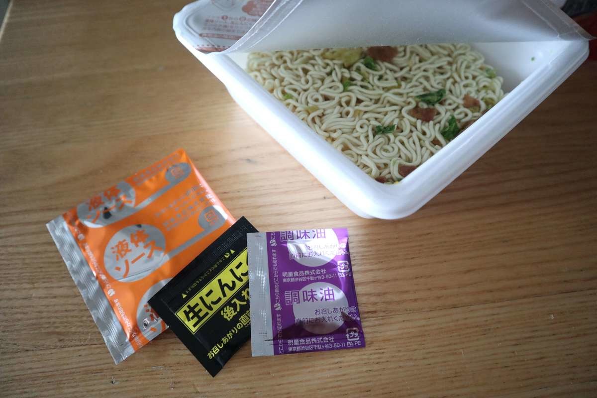 麺はフライ麺です。 液体ソース、生にんにく、調味油、かやく(キャベツ、チャーシュー)です。