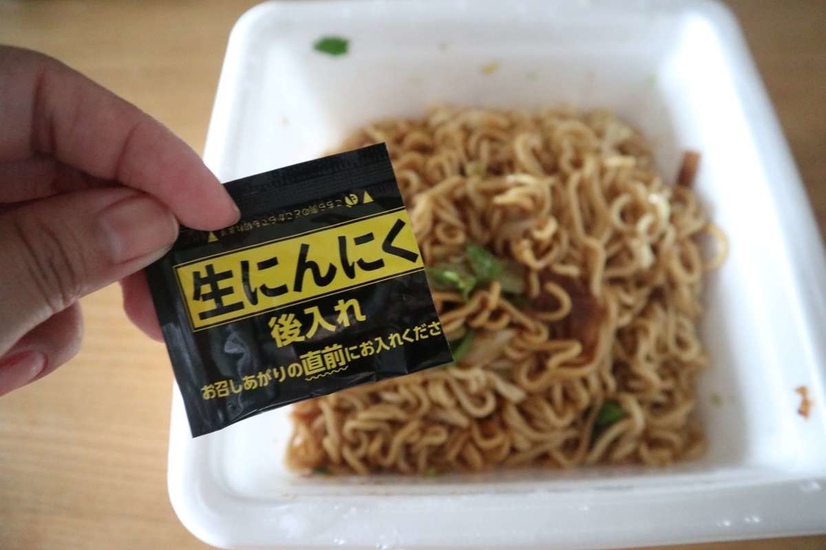 パッケージに「ガツンWニンニク 生ニンニク&焦がしニンニク油」と書いてあるだけあって、生ニンニクが別添えでついてきます!