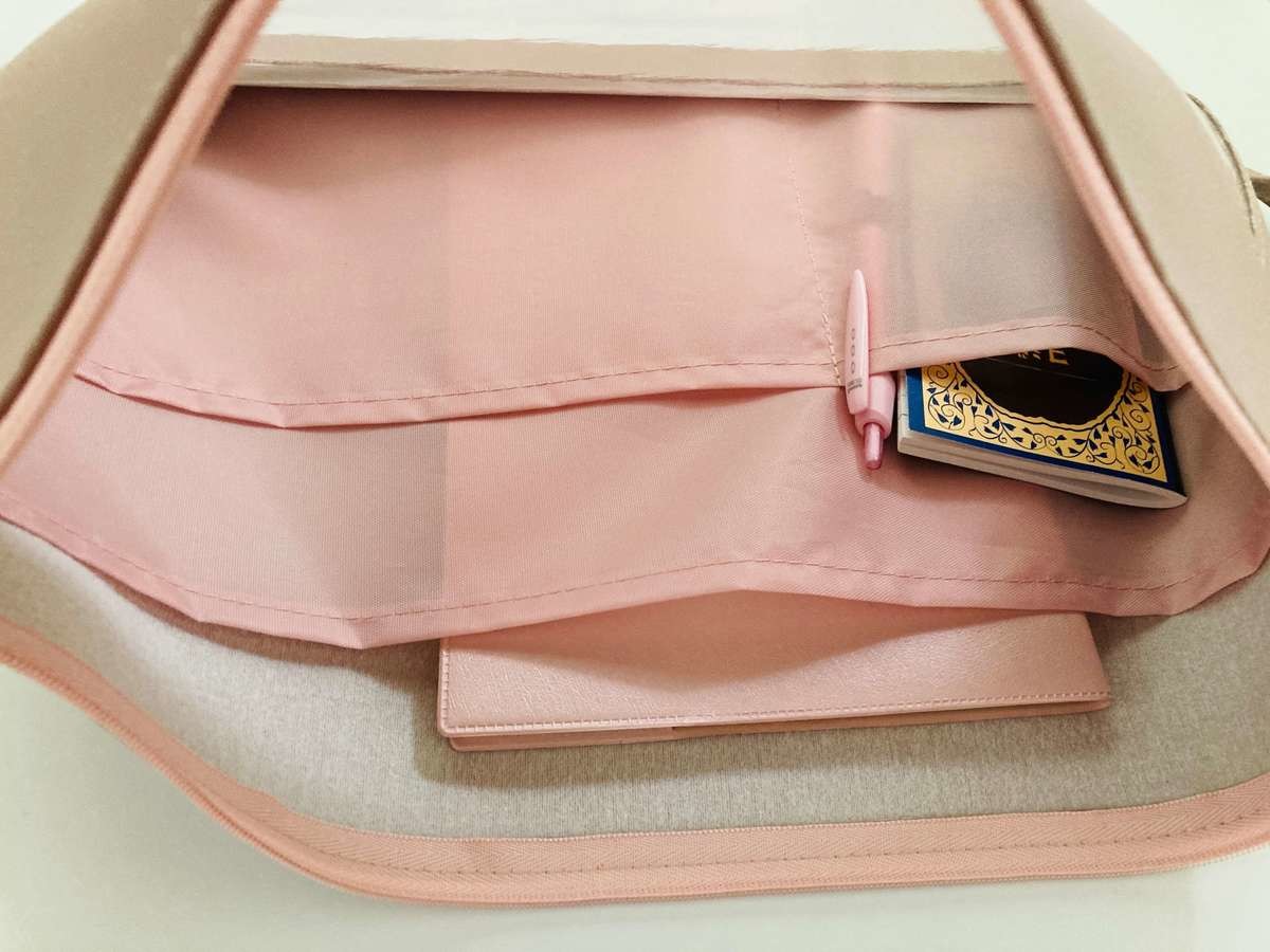 ケースの中はメインの収納スペースのほか、3つの大きさのポケット付き。A4サイズ対応なので、ノートやテキスト・書類なども余裕で入れられます!