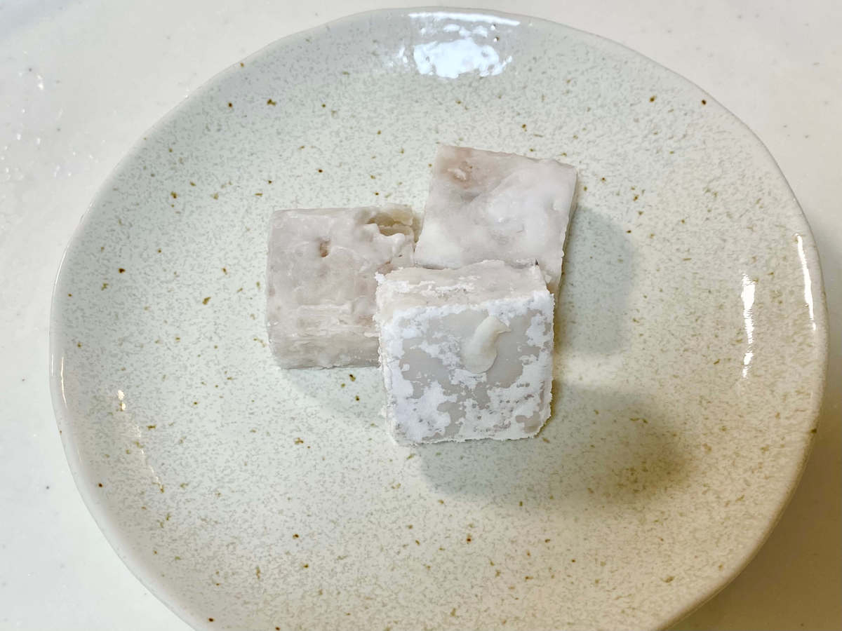 こちらの「骨取りたら」は、骨を取った魚の切り身をキューブ状に加工し、打ち粉がされています。