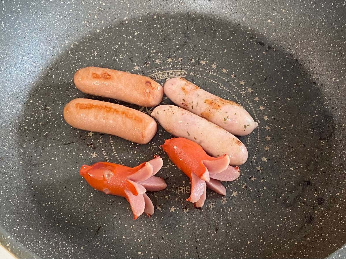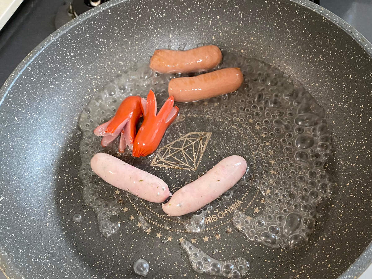 ウインナー焼き方①加熱前に水とウインナーを入れる
