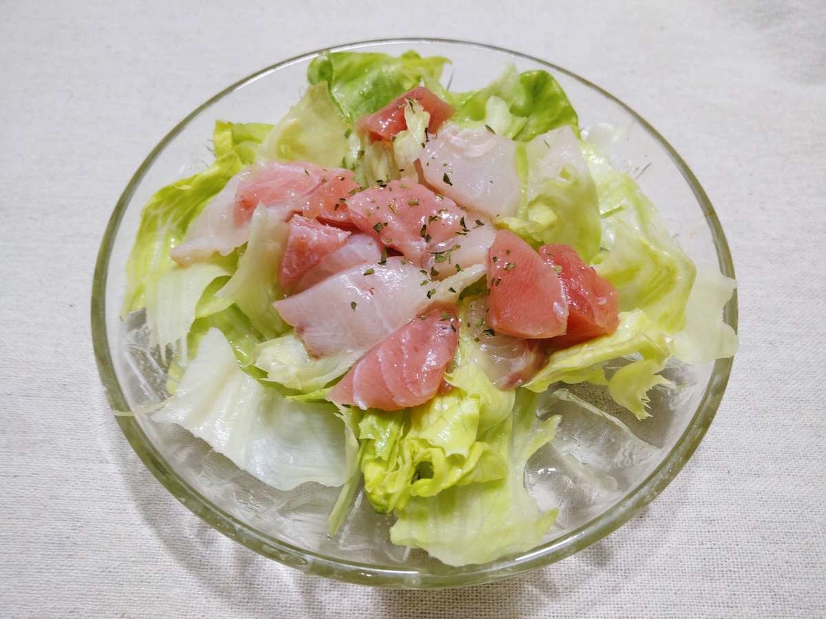 葉野菜の上に刺し身をのせ、ドレッシングをかけるだけ。