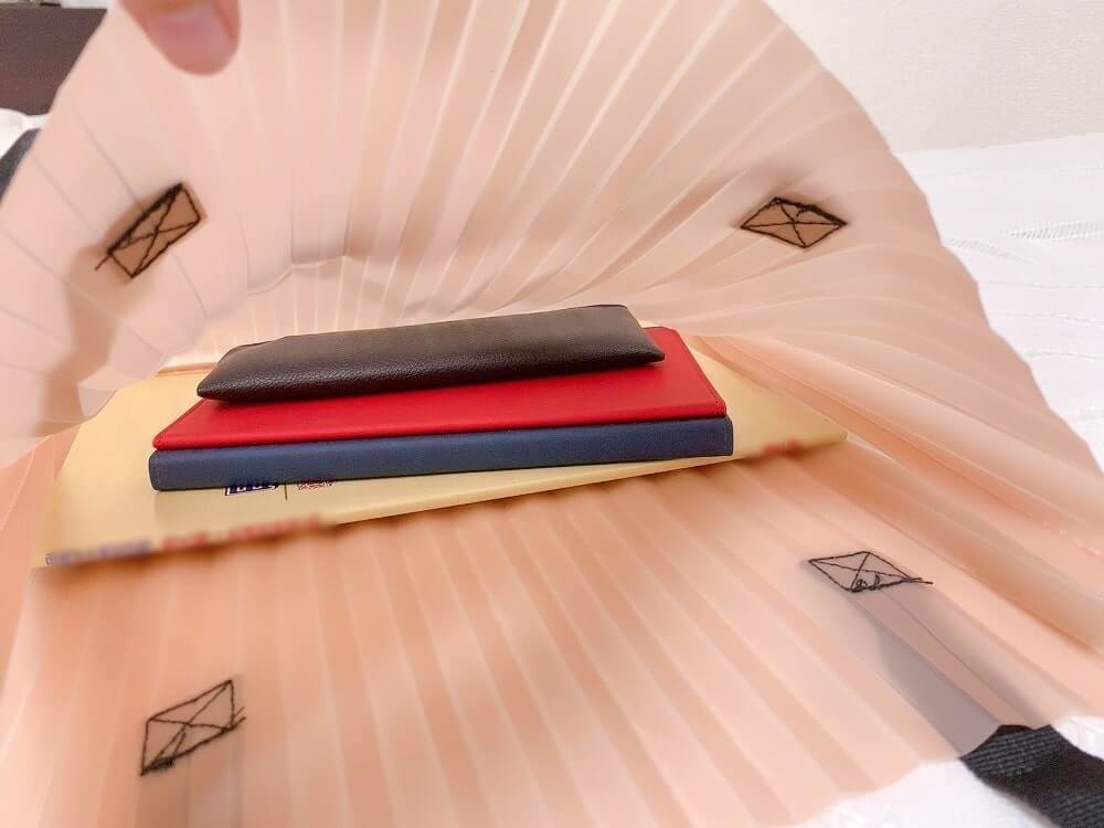 プリーツのおかげで開きやすく、見た目以上に容量があります。画像は、A4サイズのテキストを入れてみたところですが、縦にはもちろん横にしても収まりがいい。