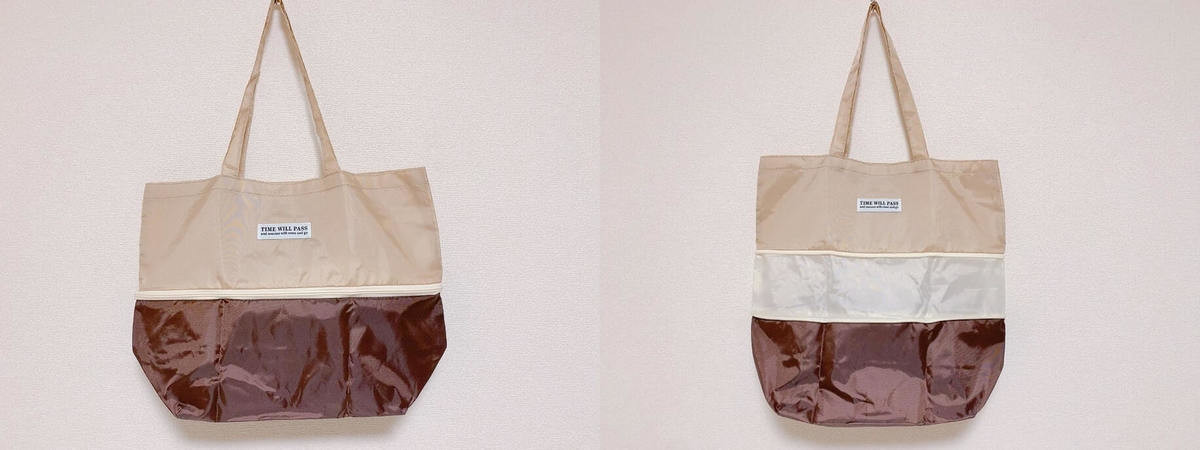 店頭で見かけたときはどれがいいか迷いましたが、たて拡張ショッピングバッグのファスナーを開けたり閉めたりしてサイズを確認したときに、私が欲しかったのはこれだ!と思いました。