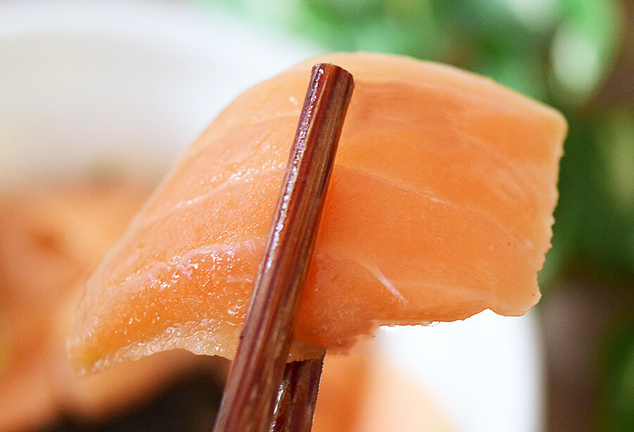 お箸で持ち上げてみると、サーモンの身がわりとしっかりしていることに驚き。安価なお刺身で時々ある「どんだけ薄くスライスしたの?」みたいなペラペラ感はありません。