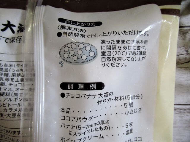 チョコ大福のパッケージ裏には「自然解凍で召し上がりいただけます。」と記載されています。