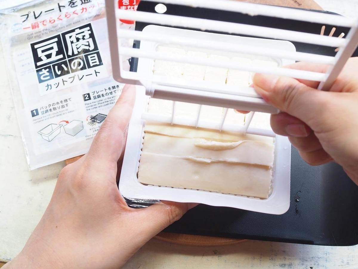 シンプルな格子状のプレートを使えば、まな板や包丁を使わずとも豆腐をさいの目にカットできるという画期的なアイテム。