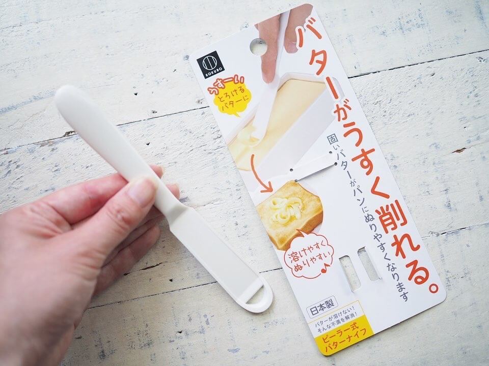 冷蔵庫から出したてのバターは硬くてカットしにくいですが、こちらのバターナイフはピーラー式でうすーくカットできます。