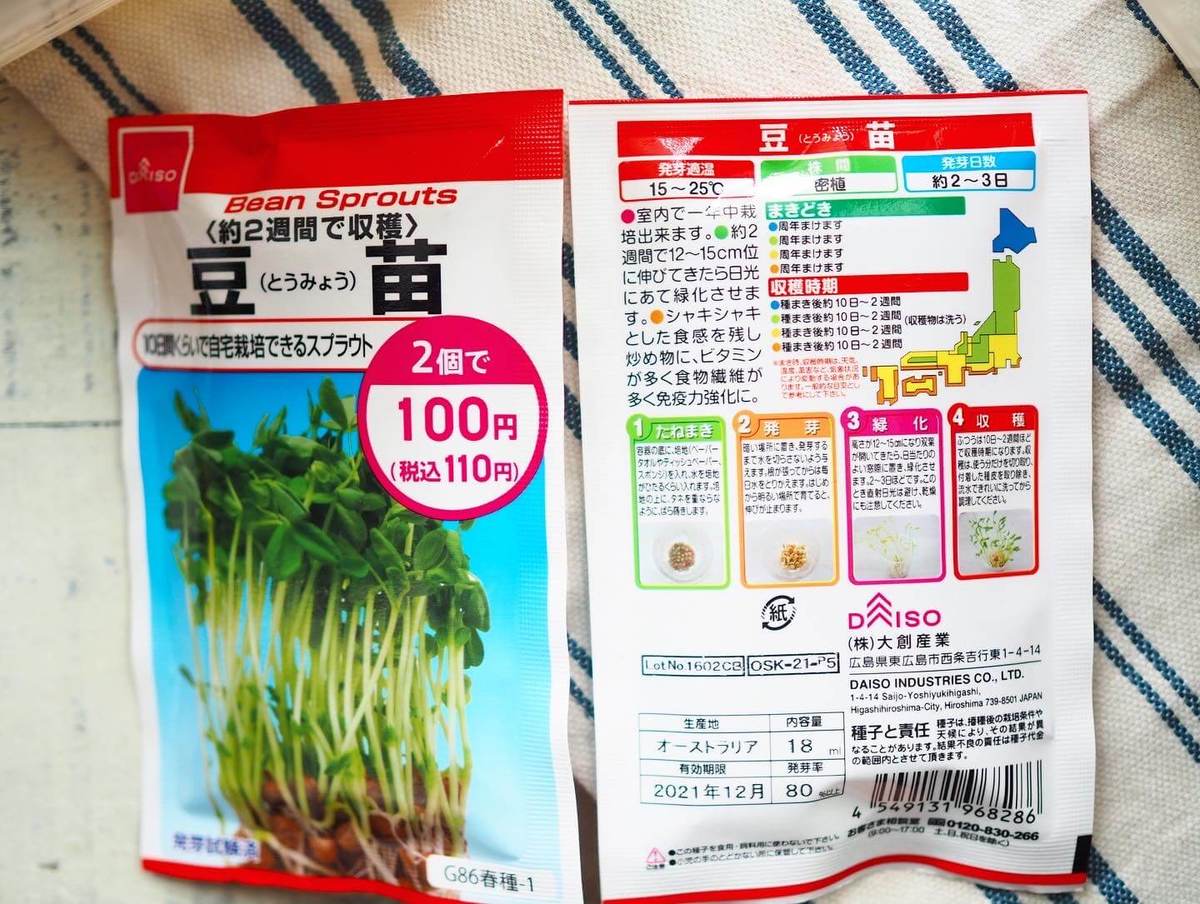 続いてご紹介するのは 「豆苗の種」です。ダイソーの植物の種シリーズは2袋110円で販売されているので、好きな種を2種類選んで買うことができます。