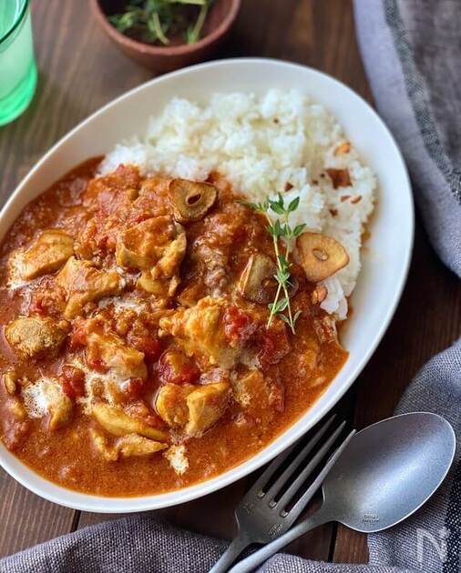 ご家庭にある材料で手軽に作れる本格バターチキンカレー。「鶏皮から出る油で具材を炒める」「すりおろし玉ねぎに鶏肉を漬ける」この2点が美味しさの秘訣です。