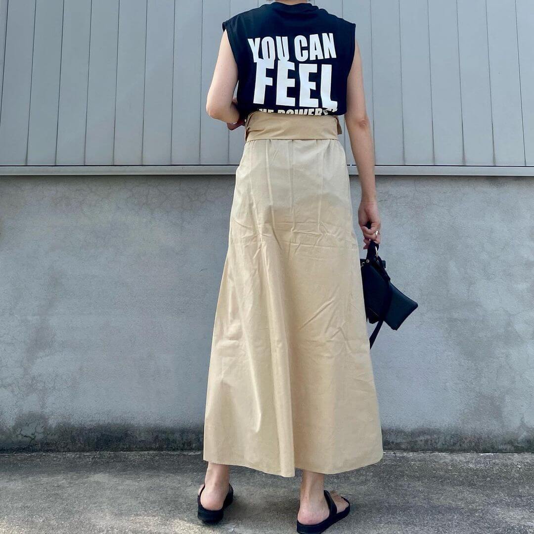 シャツワンピの上半身のボタンをあけ、袖を腰巻きすれば、シャツワンピがロングスカートに変身!