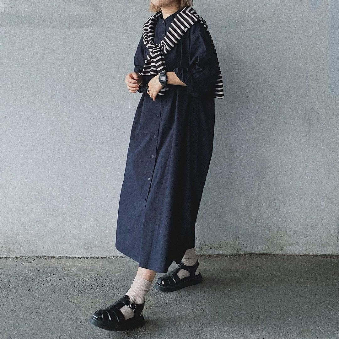 ワンピースとしてシンプルに1枚で着るときは、サンダル合わせだけでなく、靴下で遊んでみるのもおすすめ。