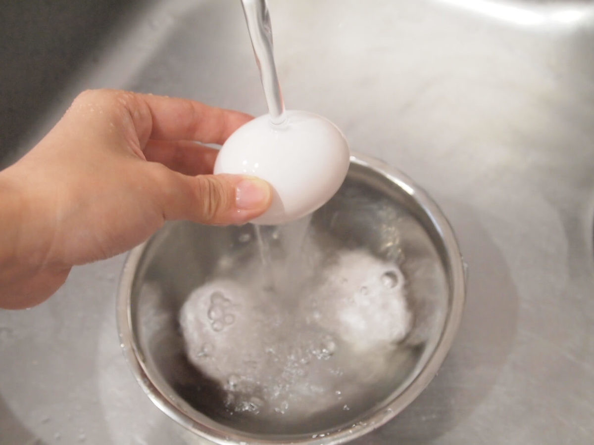 卵が茹で上がったら、冷水で冷やしながら殻を剥き、4等分にカットします。