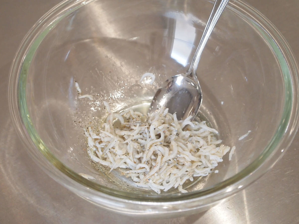 ボウルにしらす、ごま油、うま味調味料、塩、こしょうを加え、よく混ぜ合わせます。