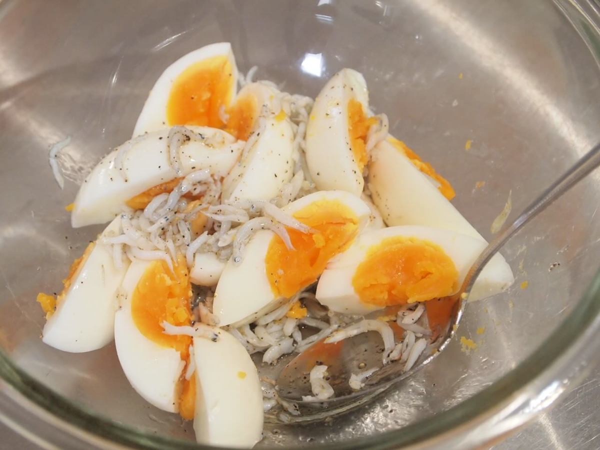 タレの入ったボウルに、ゆで卵を加え、崩れないようにそっと和えます。