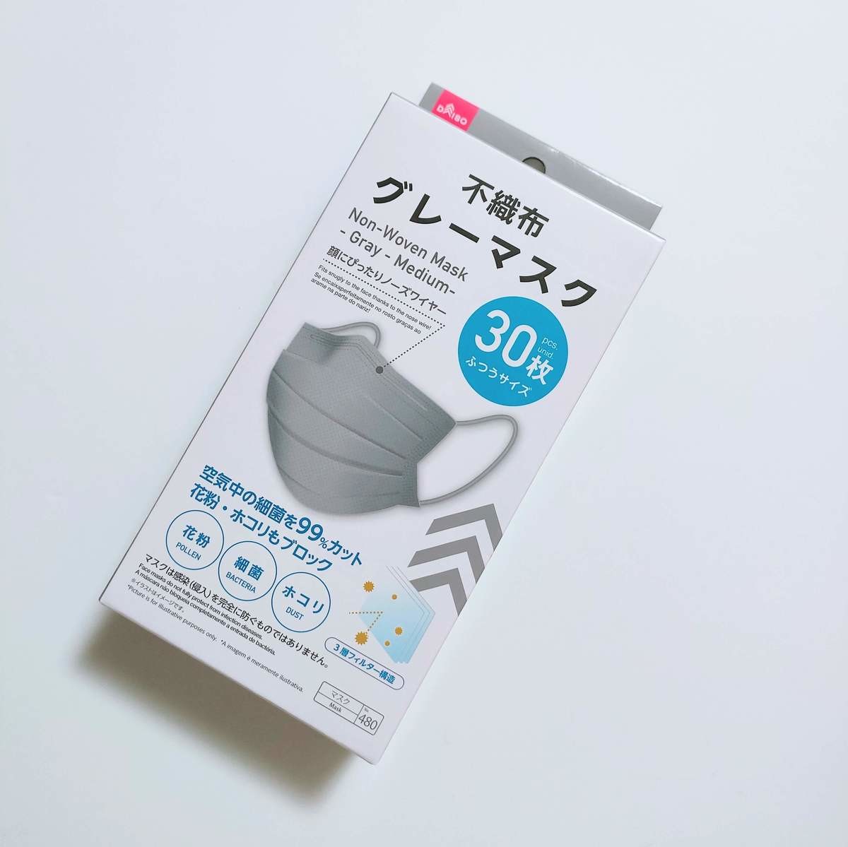 3層フィルター構造で、空気中の細菌を99%カットし、花粉・ホコリもブロックしてくれるのに、30枚110円はかなりお得ですよね。見つけたら、即買いをおすすめします!