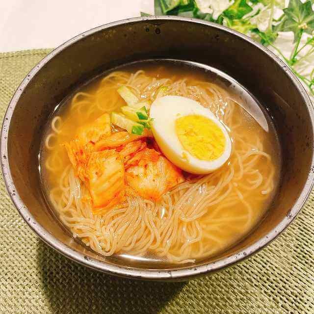 あとは完成したスープに茹でた麺を入れるだけで水冷麺が完成しました!
