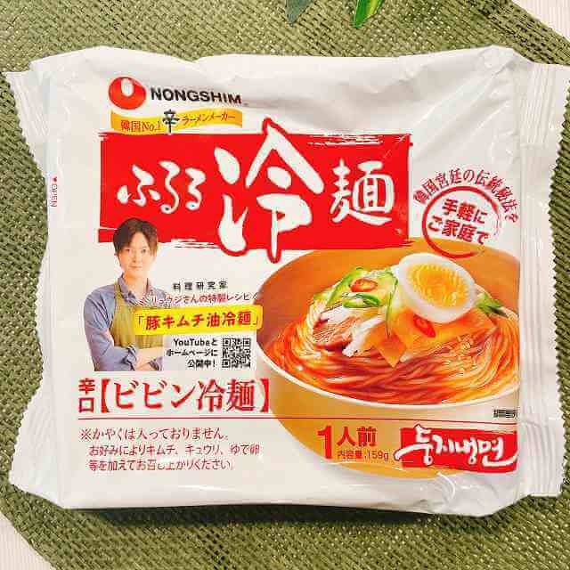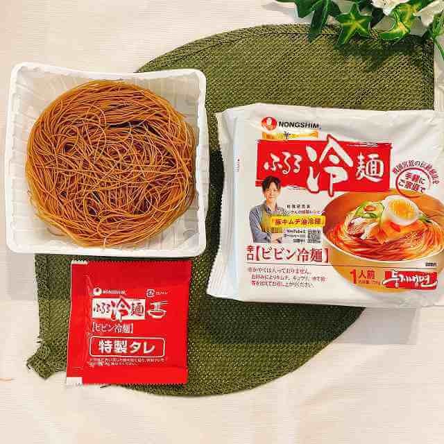 次に紹介するのはふるる冷麺・ビビン冷麺です。 こちらは先ほどの水冷麺とは対照的で赤と白を基調としたパッケージ。