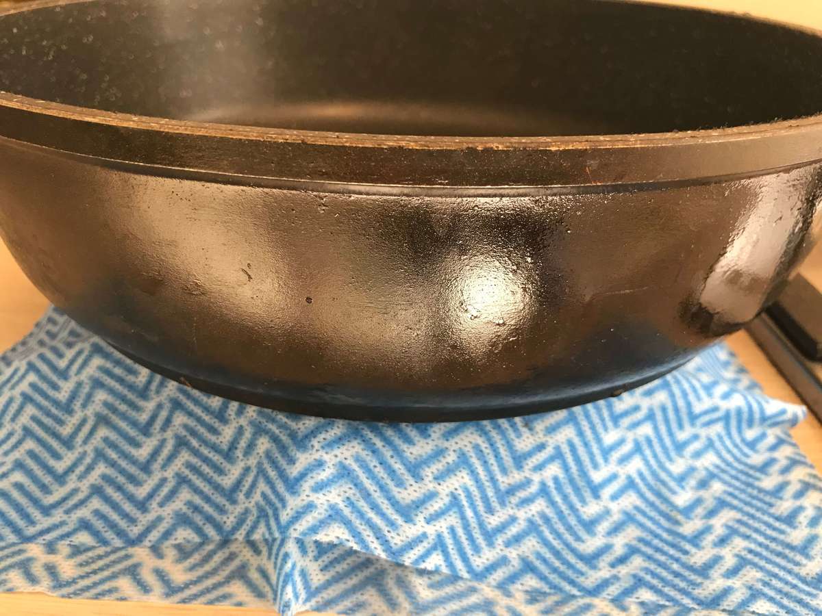 まず、フライパンを強火で40秒熱したら、コンロから外し、濡れた布巾の上に10秒のせましょう。