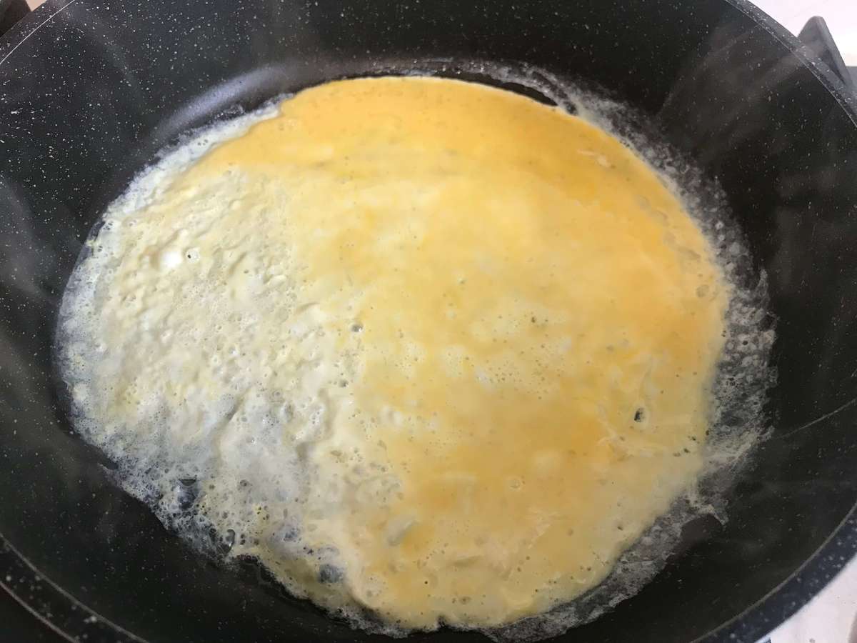 強火にする事で、フライパンに卵がくっつかずに綺麗に均一に広げる事が出来ます。