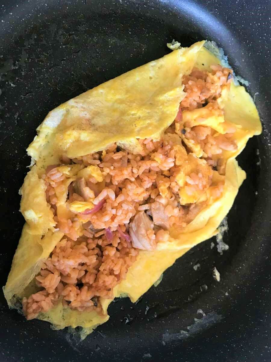 卵にケチャップライスをのせたら、包んでお皿に盛り付け。ここが一番の勝負どころ!